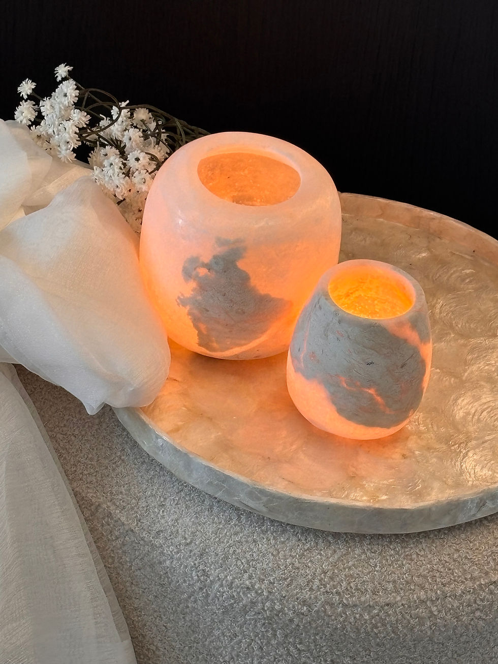 Breng warmte en elegantie in huis met onze handgemaakte alabaster waxinelichthouders uit Egypte. Elke houder is volledig uniek in kleur, vorm en tekening en laat het licht zacht door het natuursteen heen gloeien.